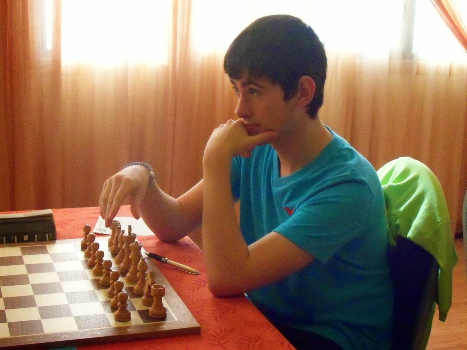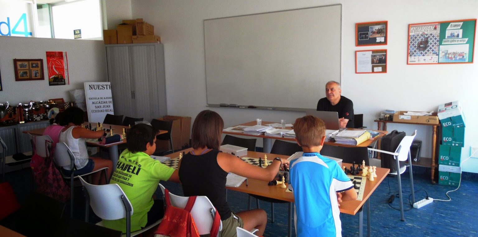Ubilava, uno de los mejores preparadores del mundo del ajedrez, impartiendo sus conocimientos a un grupo dejovencísimos alumnos y alumnas del campus de 2014 El grupo de jugadores sub-16 atienden a las explicacionesde Herminio Diego y Óscar, frente a frente