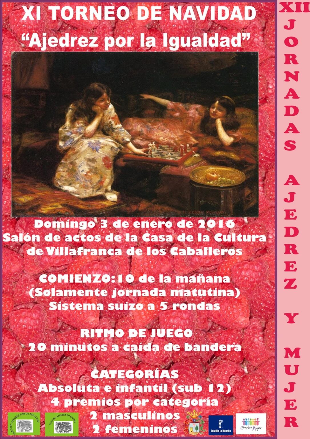 La 11ª edición del TORNEO «AJEDREZ POR LA IGUALDAD» se celebrará el domingo 3 de enero de 2016, a partir de las 10 de la mañana, en la Casa de la Cultura de Villafranca de los Caballeros. Para ver toda