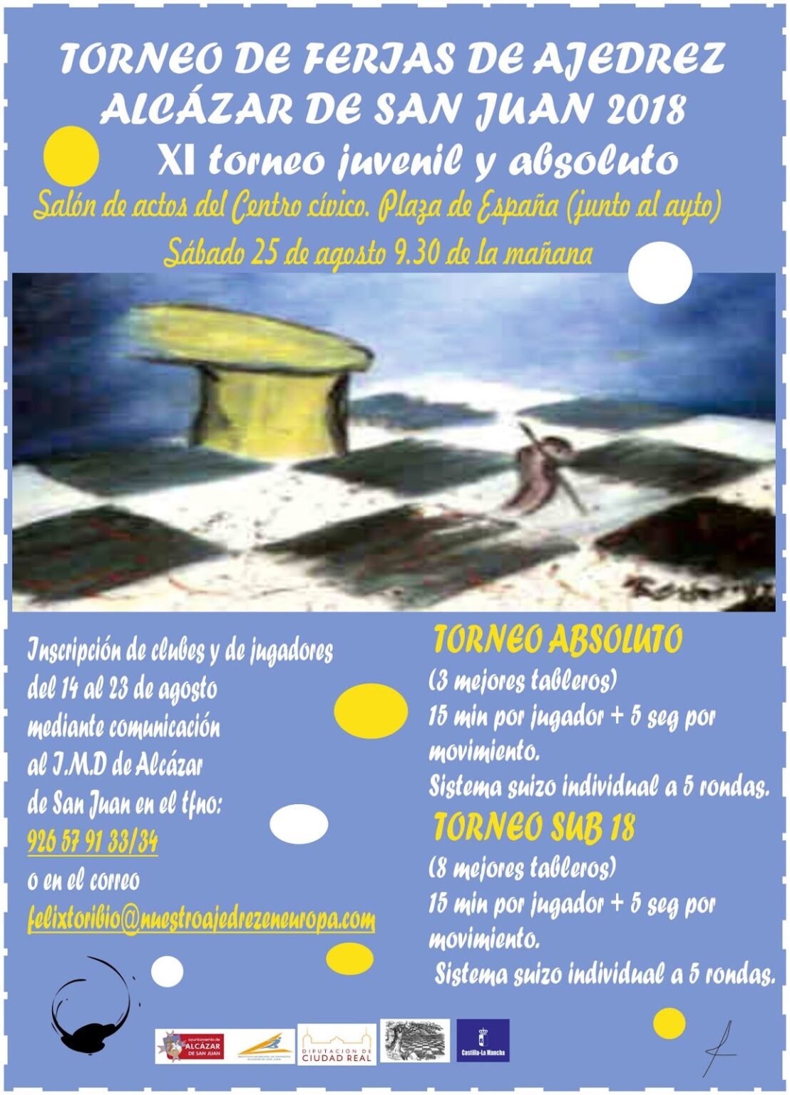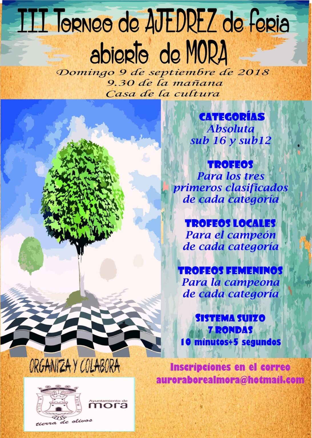 La casa de la cultura de Mora albergará la 3ª edición del Torneo de Feria el domingo 9 de septiembre en jornada de mañana. El ritmo de juego será de 10 minutos por jugador + 5 segundos de incremento por