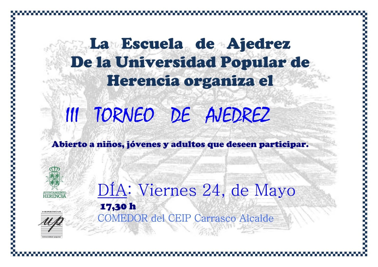 Este viernes, día 24 de mayo, se celebrará la 3ª edición del Torneo de la Escuela de Ajedrez de la U.P. de Herencia en el colegio Carrasco Alcalde. El torneo comenzará a las 17,30 en el comedor del Carraco Alcalde