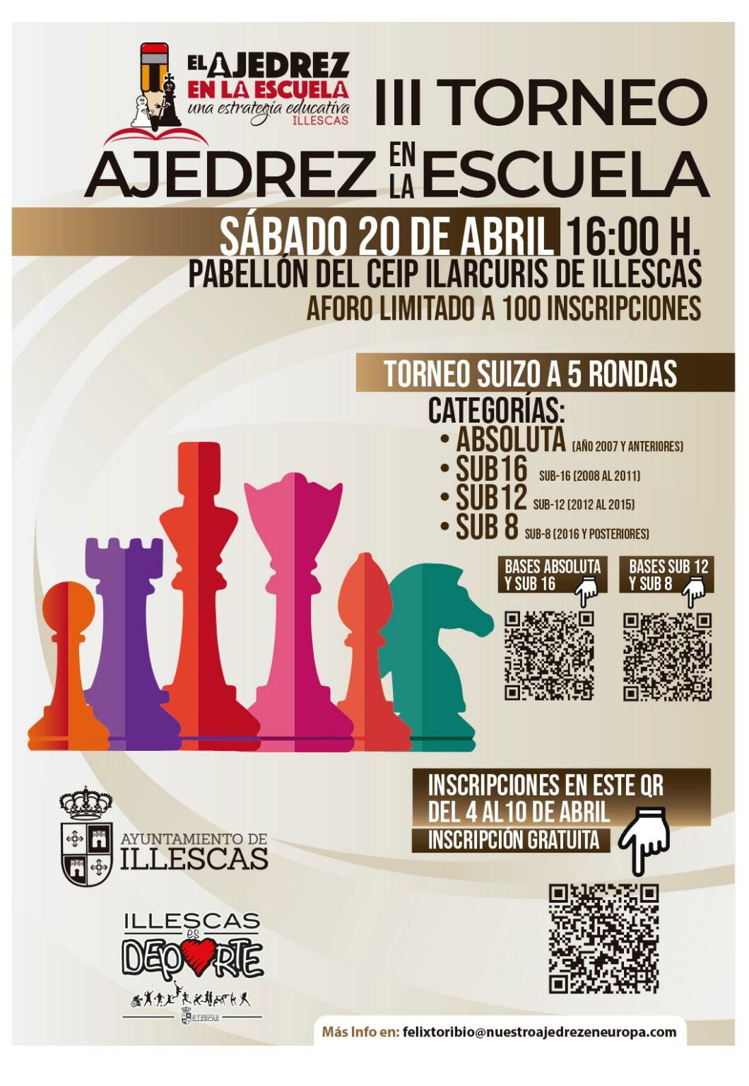 El sábado 20 de abril tendrá lugar un nuevo «Torneo del ajedrez en la escuela» de Illescas. El pabellón del colegio Ilarcuris, acogerá los dos torneos en los que se divide en las categorías absoluta y sub-16, por una