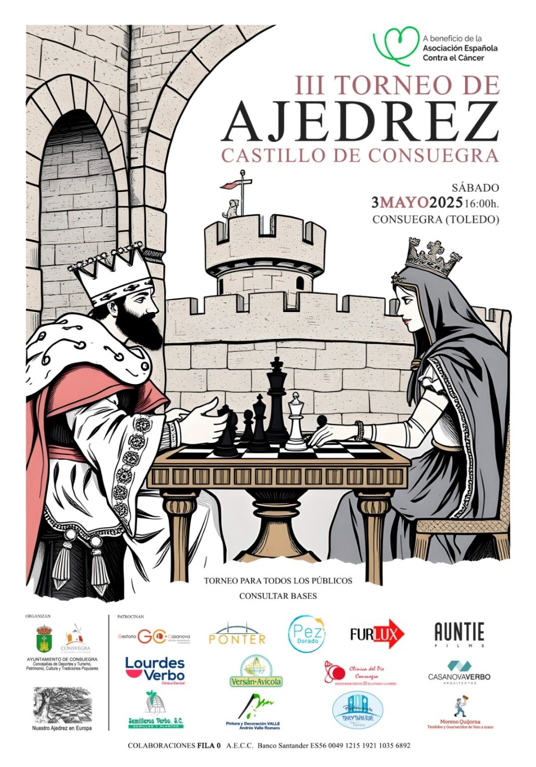 El sábado 3 de mayo de 2025 se celebrará la 3ª edición del “Torneo ajedrez en el castillo de Consuegra” que volverá a tener carácter benéfico. En esta ocasión las cuotas de inscripción se destinarán a la Asociación Española