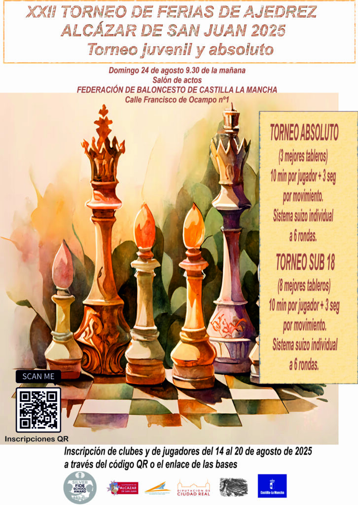 Esta es la información del XXII Torneo de Ferias de Alcázar de San Juan que se celebrará el domingo 24 de agosto por la mañana en la sede de la Federación Regional de Baloncesto en Alcázar de San Juan. En las bases consta el localizador del lugar de juego y un enlace con el formulario para realizar la inscripción hasta el 20 de agosto o hasta completar los 80 participantes que permite la sala de juego. Como todos los años se jugarán 2 torneos por sistema suizo individual diferenciados (ABSOLUTO Y SUB18) con trofeos a los 3 primeros equipos de cada categoría. También se entregará una pieza de ajedrez elaborada por la Alfarería de los Hermanos Peño a todos los participantes.