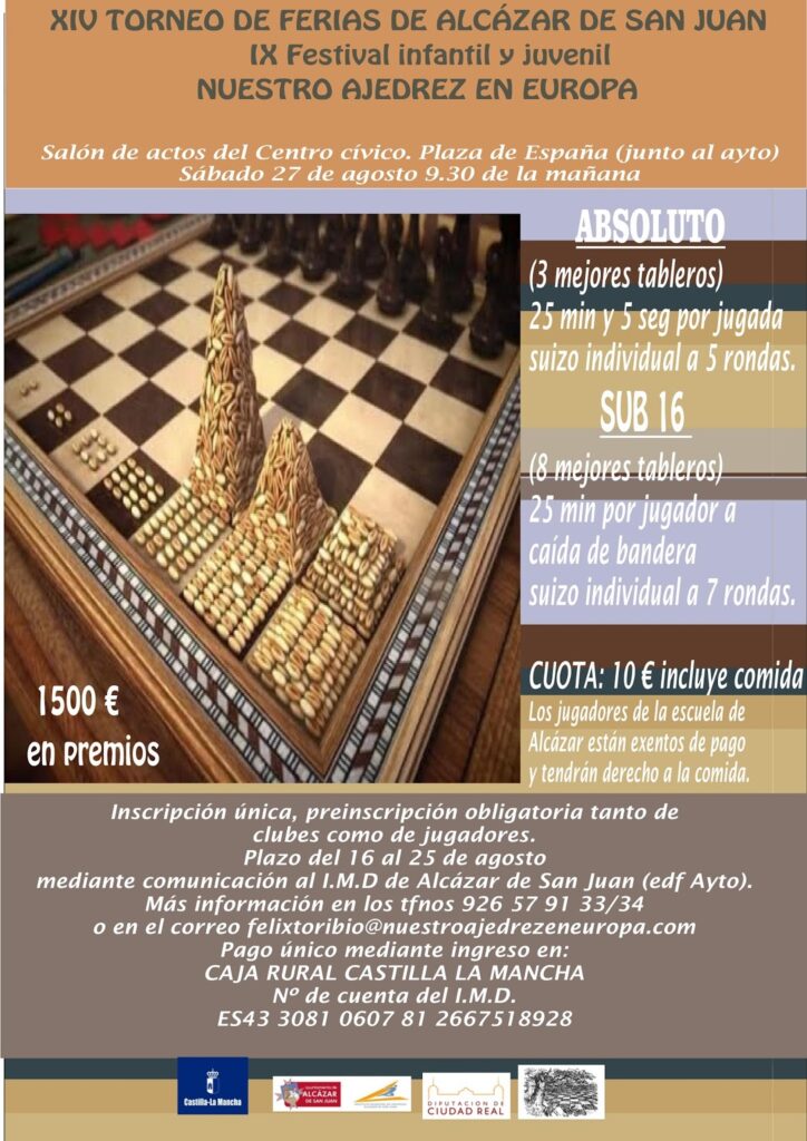 El sábado 27 de agosto se celebrará la XIV edición del Torneo de Feria de Alcázar en el Centro Cívico de la Plaza de España. Los premios (1.500 € en total) y los ritmos de juego son idénticos a los del año pasado, aunque se incorporan dos importantes novedades a tener en cuenta.