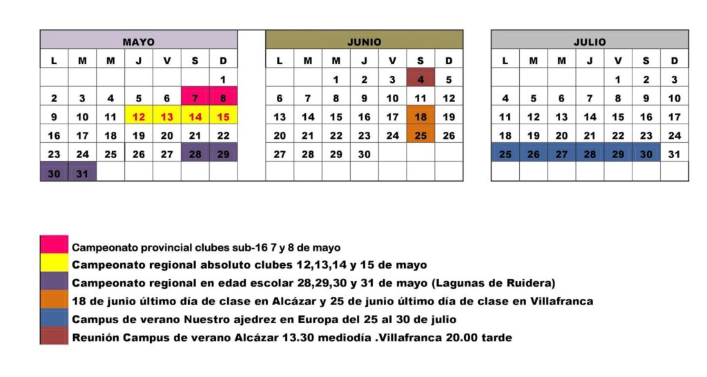 Ante la próxima finalización de la temporada 2015/2016 en las escuelas deportivas de ajedrez de Alcázar de San Juan y Villafranca de los Caballeros, también anunciamos que el 18 de junio concluirán las clases en Alcázar y el 25 de junio en Villafranca.