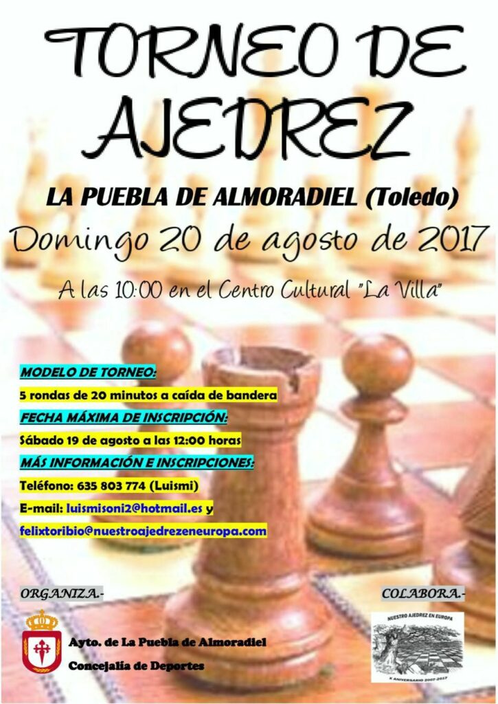 El primero será el promovido por el ayuntamiento y la escuela de ajedrez de La Puebla de Almoradiel (Toledo), que se celebrará el domingo 20 de agosto. La inscripción es gratuita y se puede realizar por cualquiera de los medios descritos en el cartel. Hay trofeos para los 2 primeros clasificados en las categorías absoluta y sub-12, acompañados de los campeones locales de cada una de ellas.