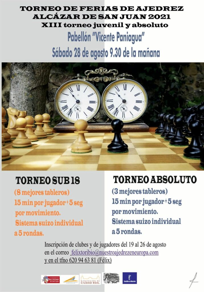 El próximo sábado 28 de agosto recuperamos el torneo de feria de Alcázar de San Juan después de la interrupción obligada por las circunstancias sanitarias de 2020. El formato de esta edición número 18 seguirá siendo el mismo, con 2 torneos diferenciados para los aficionados y las aficionadas de la categoría juvenil (sub-18) y el otro para los ajedrecistas de categoría absoluta.