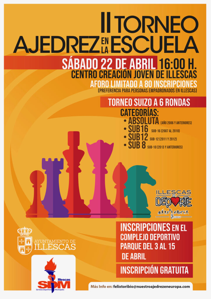 El sábado 22 de abril los aficionados al ajedrez de cualquier edad tienen una cita para disfrutar de su deporte preferido en el II Torneo del Ajedrez en la Escuela que se celebrará en el Centro de Creación Joven de Illescas. En esta ocasión se presentan dos novedades: la primera es la celebración de 2 torneos en paralelo, uno para chicos y chicas de hasta 12 años de edad y el otro para personas de más de 12 años sin límite de edad; a este cambio se une la apertura de la condición de la edad, no estableciéndose edad mínima (pueden participar también el alumnado de infantil) ni edad máxima (al poder participar mayores de 16 años).