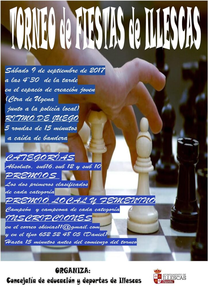 El 9 de septiembre por la tarde, el Espacio de Creación Joven de Illescas recibirá a los aficionad@s que quieran pasar unas horas jugando unas partidas. Los trofeos se repartirán entre las categorías absoluta, sub-16, sub-12 y sub-10. En el cartel figura la información para realizar las inscripciones y en las bases se pueden consultar más detalles.