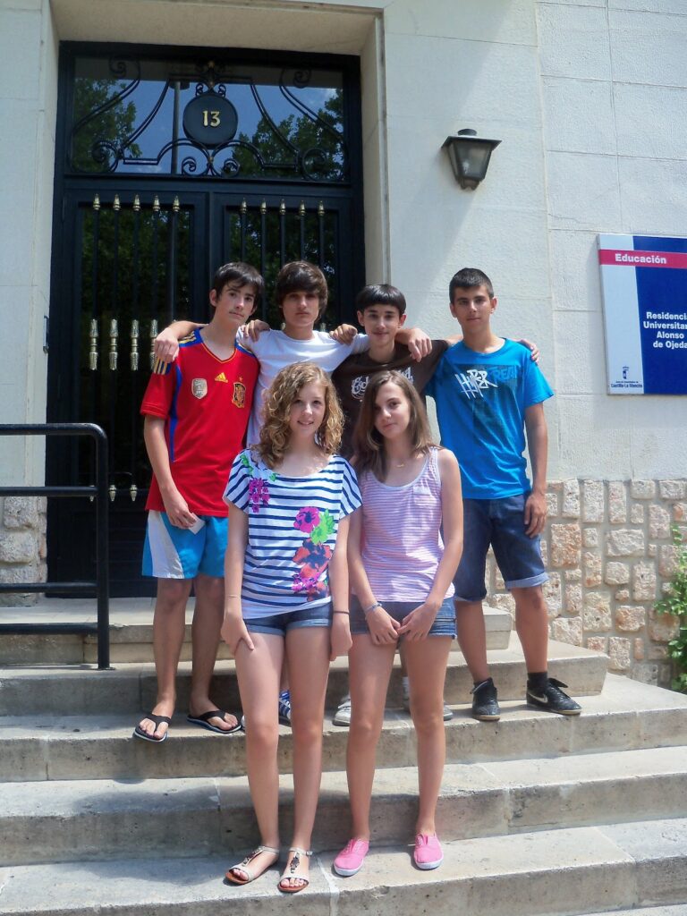 | Nuestro equipo en la entrada a la residencia universitaria Alonso de Ojeda de Cuenca |