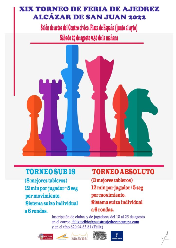 El sábado 27 de agosto a partir de las 9:30 de la mañana se disputará la XIX edición del Torneo de Feria de Alcázar de San Juan. La competición estará organizada en 2 categorías diferenciadas: absoluta y sub18, entregándose trofeos por equipos a los 3 primeros clasificados en cada categoría. El periodo de inscripción será del 18 al 25 de agosto, vía WhastApp al teléfono indicado en el cartel y las base o mediante solicitud al correo electrónico: felixtoribio@nuestroajedrezeneuropa.com
