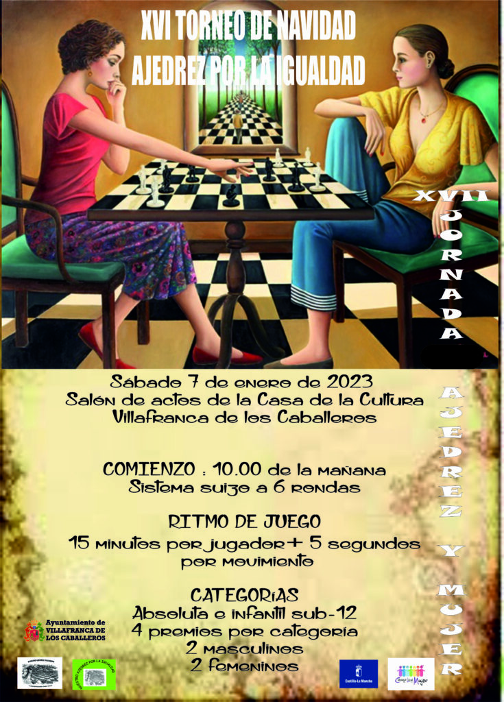 Tras dos años de ausencia, regresa el Torneo de Navidad «Ajedrez por la Igualdad». La XVI edición se celebrará el sábado 7 de enero de 2023 en el salón de actos de la casa de la cultura de Villafranca de los Caballeros, con 2 categorías diferenciadas para el reparto de trofeos: sub-12 y absoluta. El plazo de inscripción quedará abierto el 1 de enero y finalizará el 4 de enero de 2023. El ritmo de juego será de 15 minutos por jugador + 5 segundos de incremento por movimiento a un total de 6 rondas. Los torneos comenzarán a las 10 de la mañana y finalizarán sobre las 14 horas, aproximadamente. En el cartel y las bases tenéis más información.